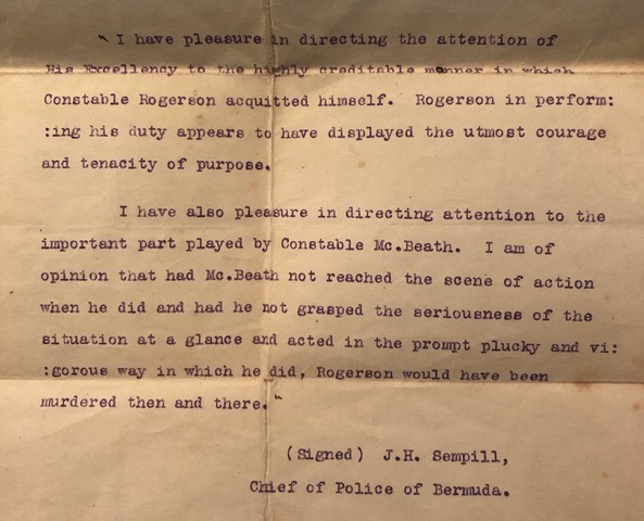 Shortly after we published the above article about Sean’s two year project in cataloguing the inventory of the Bermuda Historical Society’s collection, we received the following additional information from Sean about the history of Albert Rogerson who was awarded the King’s Police Medal for Bravery as a result of his action in making that arrest even though badly injured during the altercation.